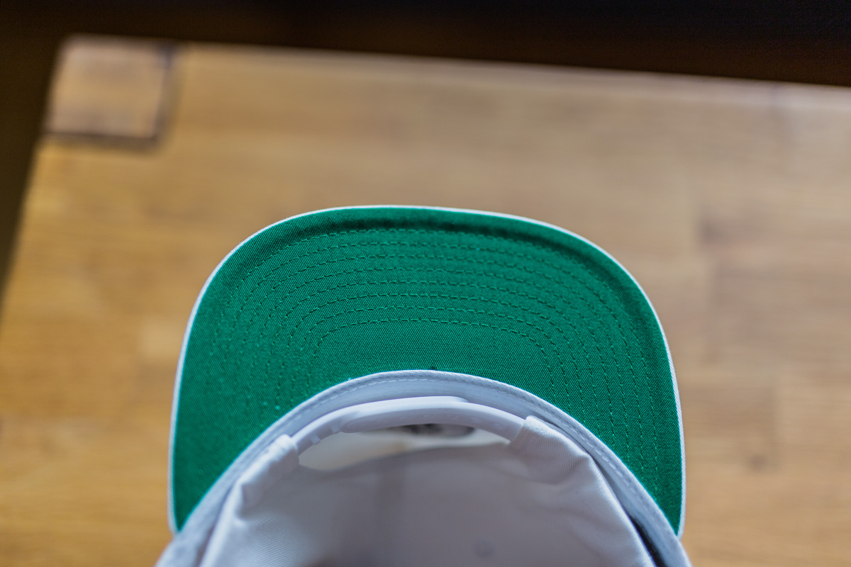 Die Yupoong Snapback white mit grünem Innenschild (siehe Bild).